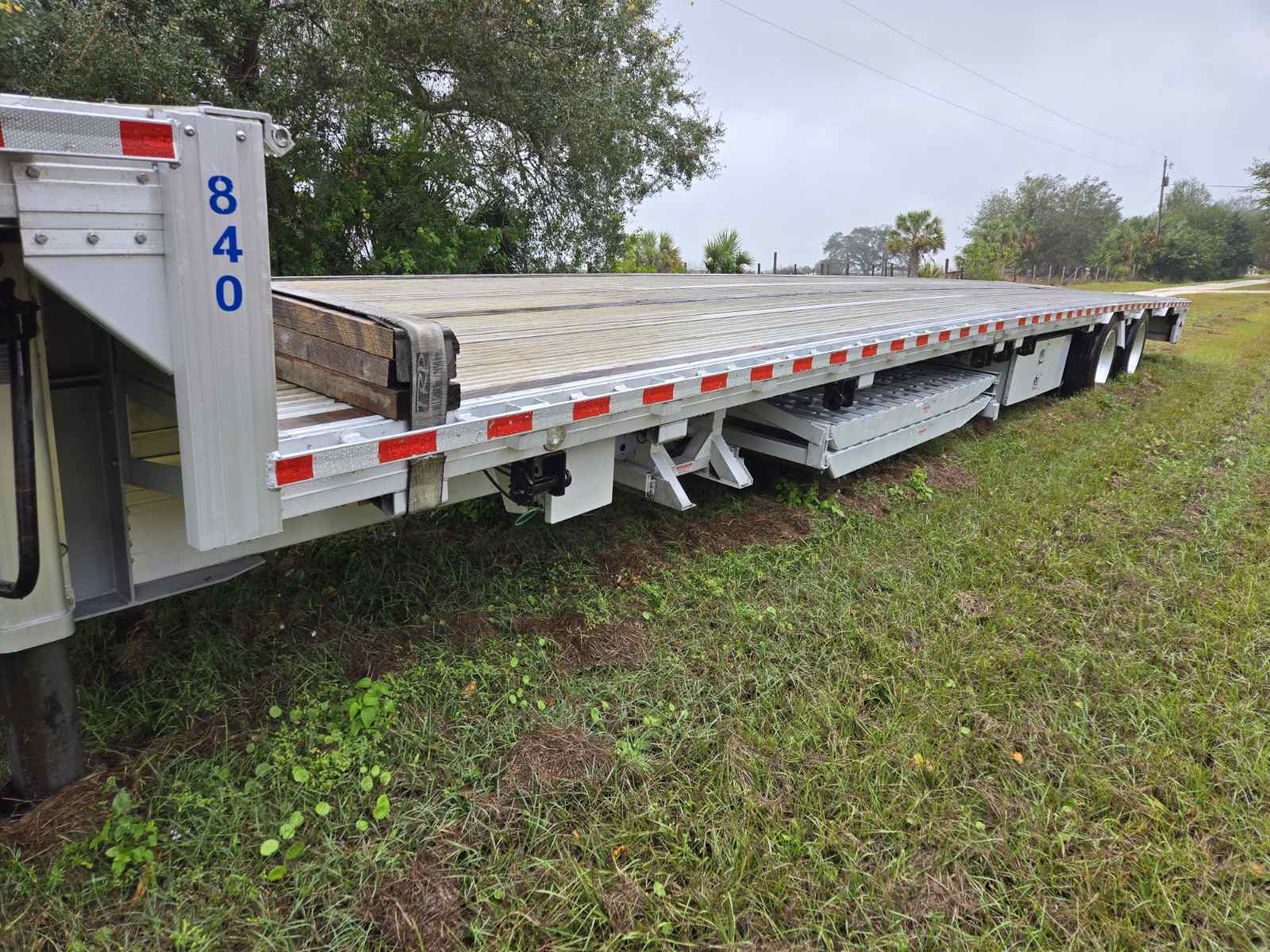 2021 Reitnouer Dropmiser; 53×102; Rear axle slide; 10’8” upper deck, 42’ lower deck; Cali and BC legal in the closed position 40′ kp to the center of the rear axle; 10’2″ axle spacing open, 60″ closed; 25k suspension; Hendrickson Tire Inflation; Inside steel wheel aluminum outer; 255/70R 22.5 Yokohama Tires; Mini coil pack; 30″ kin pin; 3 wood nailers; Double pipe spools; 5 Peterson led lights per side, 3-5-3 rear; Flaps after both axles, mud flap brackets cut out for winch to pass; Automatic dump valve on all axles; Winch track drivers side; 12 winches; 20 6″ oval tiedowns. Empty Weight 10324 lb.